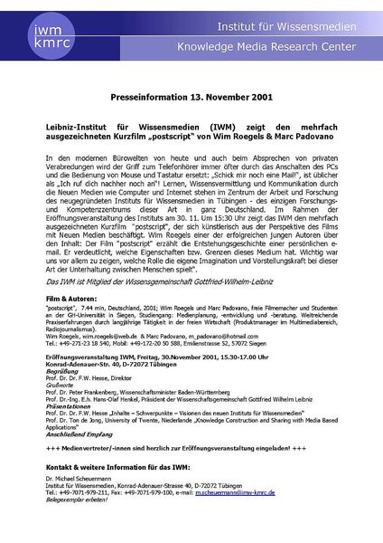 Der Film "postscript" erzählt die Entstehungsgeschichte einer persönlichen Email. Er verdeutlicht, welche Eigenschaften bzw. Grenzen dieses Medium hat und vor allem welche Rolle die eigene Imagination dabei spielt.